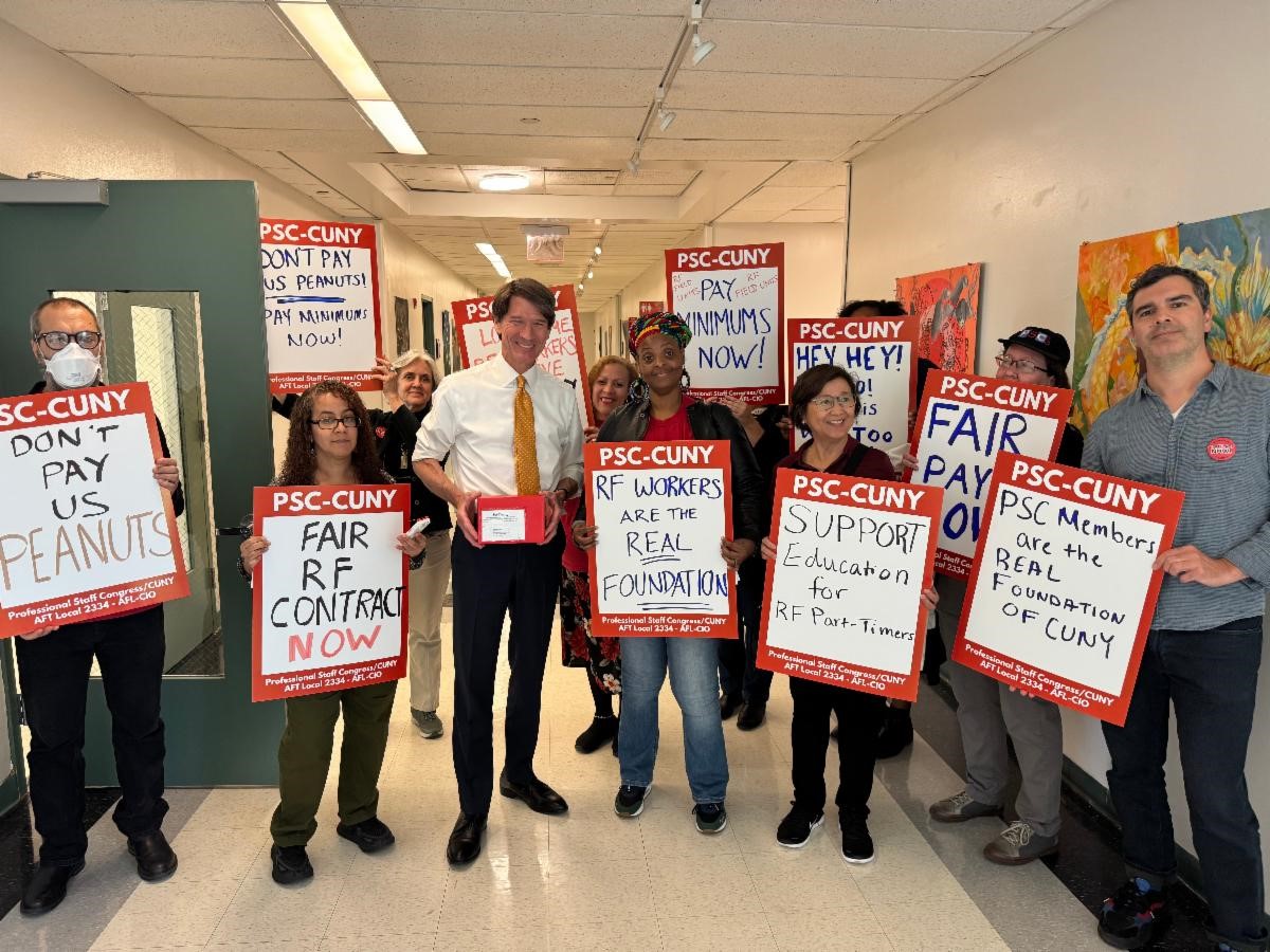 Join AFT President Randi Weingarten and AAUP President Todd Wolfson for an update on the AAUP/AFT “Higher Education: Saving Lives, Building Futures, Powering the Economy” campaign on Wednesday, Dec. 10, from 4:00-5:00 PM. PSC members have worked in coalition with our regional colleagues at AAUP and Higher Education Labor United, as well as with student organizations to support the campaign. Together, we’ve organized a city-wide town hall at NYU, a protest of billionaire Marc Rowan, the man behind Trump’s authoritarian “compact” for universities, and a forum in the PSC Union Hall, Combatting Contingency in a Time of Political Repression. The national campaign will broaden its reach in the coming year to focus on the midterm congressional elections.