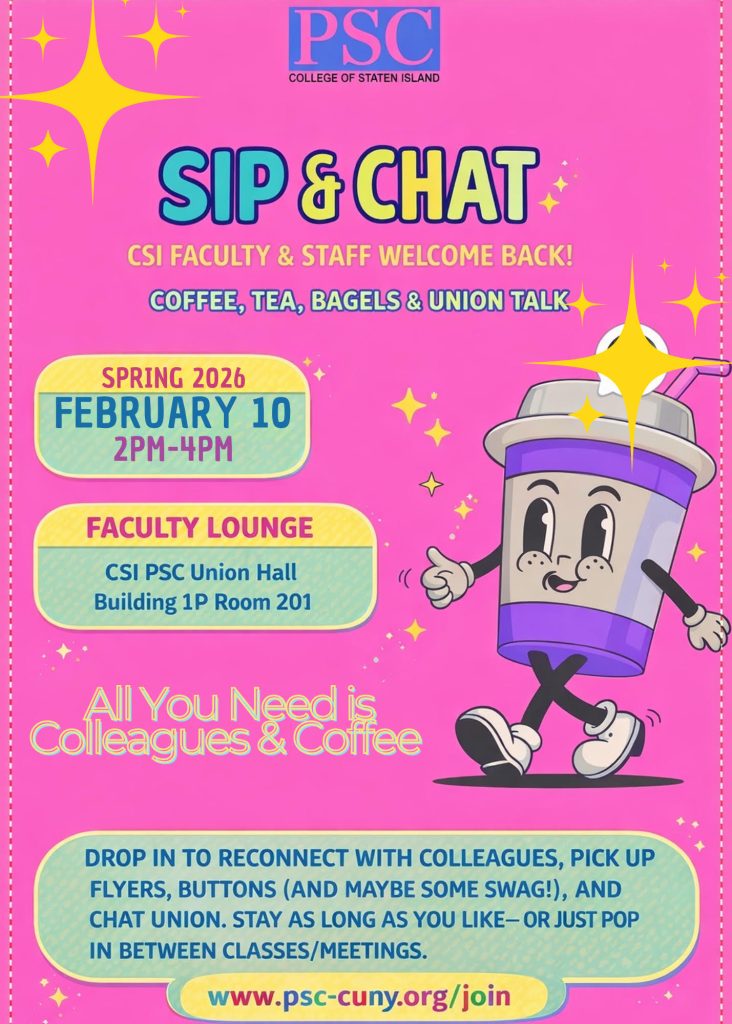 Join the CSI PSC here at CSI for our Spring Sip and Chat next Tuesday, February 10th at 2pm – Bldg#1P Room#201 – Drop in to reconnect with colleagues, pick up flyers, buttons, and talk union. We will have bagels and coffee and tea!