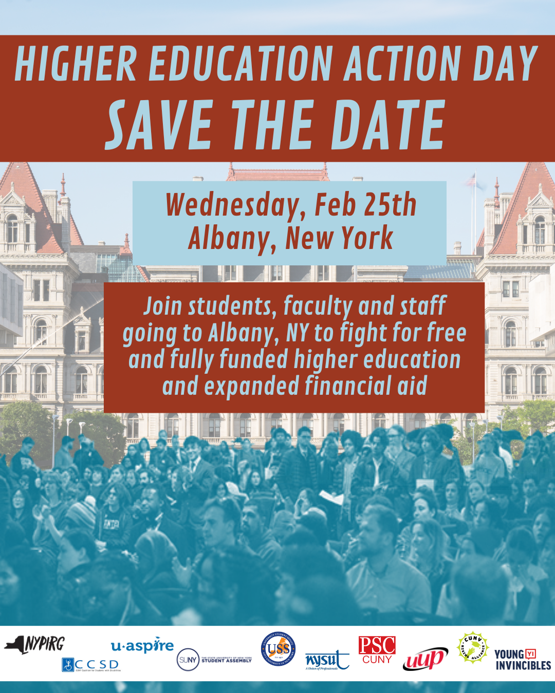 Showing up in-person in Albany is one of the most impactful actions you can take to fight for the university system that we, and our students, deserve. We will be lobbying alongside coalition partners from across New York State, including union siblings at SUNY (UUP ), student organizations (CUNY Rising Alliance, CUNY USS, and SUNY SA), and community partners including NYPIRG and Young Invincibles. Our demands will include funding to hire new faculty and staff, updated campus facilities, free tuition for all public higher education students, and more!