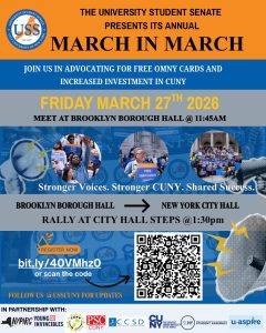 The CUNY University Student Senate is leading the annual March in March for CUNY on Friday, March 27th, just in time for a push before the April 1st state budget deadline. The event will kick-off at 11:45 AM at Brooklyn Borough Hall. It will end at City Hall with a 1:30PM rally and student-led press conference. Sign up to support the USS campaign to make transportation more accessible for CUNY students and to ensure every student has the resources they need to succeed.