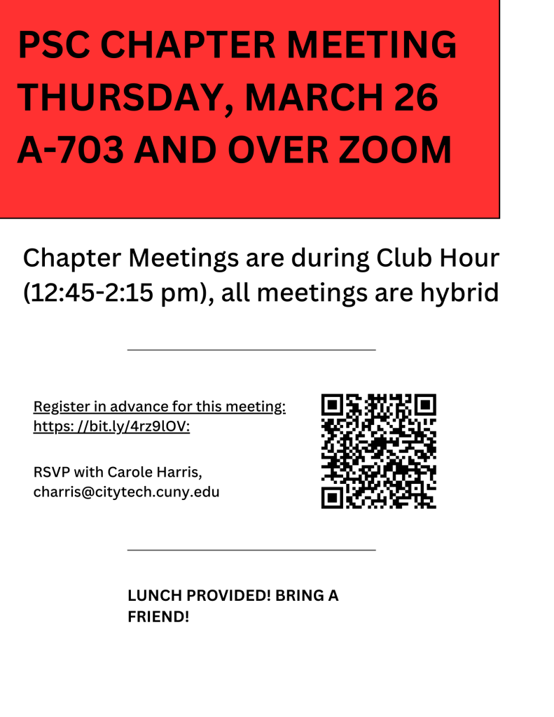 We look forward to seeing you on for our March 26 chapter meeting. You’ll have the opportunity to meet the union leadership on our campus, share your ideas/concerns about issues important to our campus, and socialize.