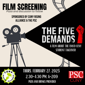 This documentary film tells the story of the CCNY students who in 1969 demanded an expanded curriculum that would include Black and Puerto Rican studies. We also learn the fascinating origin story of the SEEK program. The screening, which is sponsored by our PSC Chapter and the CUNY Rising Alliance, directly follows the “Know Your Rights” workshop (which takes place 12:30-2 pm)–in the same room. Pizza and light refreshments provided.