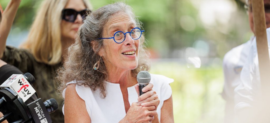 Michelle Fine at a rally against the new McCarthyism outside City Hall. (Credit: Paul Frangipane)