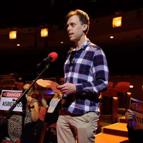 Sean MacDonald, Professor, New York City College of Technology: “…Midway through the program during Lincoln Restler’s presentation, an audible ‘thud,’ followed by an enormous cloud of dust descended from the ceiling in the hallway adjacent to the event space, escaping from a tarp installed to protect from repeated ceiling leaks in that same area. Some attendees immediately began trying to wave the dust away, while others put on masks. It should be noted that this entire ground floor area also serves as a gathering and study space for students… The dust incident is just the latest episode of many involving persistent problems with leaks, mold, falling ceiling tiles and related problems throughout the Namm and Library Buildings in recent years. Our repeated requests to have potentially toxic substances tested – for example, the dust at the Town Hall, or visible mold in many areas that have seen water intrusion – have too often been denied.” (Read Sean MacDonald’s full testimony.)