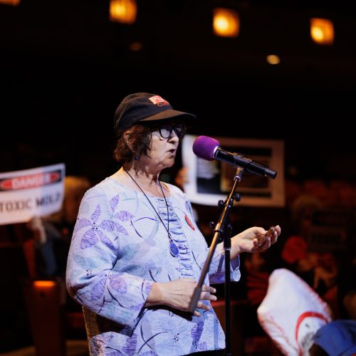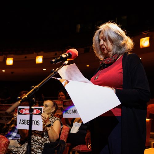Carole K. Harris, PSC NYC Tech Chapter Chair and Professor, New York City College of Technology: “In an emergency health and safety meeting with City Tech President Santiago, we expressed concern about the dust that shot out from the ceiling at the Town Hall. People reported symptoms after the incident. One attendee reported feeling a “grittiness” in his throat that day; a student reported “coughing up a storm” after his asthma acted up. After returning home, he needed to use his nebulizer machine due to a full-blown asthma attack. I remained congested for several days. We circled back to our major question: what was in that dust? President Santiago confidently replied that it was only cinder block dust (“Nothing to worry about.” “No harm, no foul”). But cinder block dust often contains silica, a dangerous, toxic substance. In fact, there’s no such thing as harmless dust. All dust is bad.” (Read Carole K. Harris’s full testimony and watch their testimony here.)