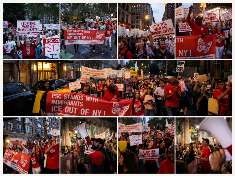 Thousands of New Yorkers displayed a powerful message of resistance to Trump’s regime of mass deportation at a protest yesterday, September 25th in Lower Manhattan. Hundreds of PSC members joined elected officials and members of more than 30 other unions and community organizations as they shut down the streets surrounding 26 Federal Plaza to make it clear that they will not stay silent as ICE repeatedly commits violent and unlawful actions. Read more here.