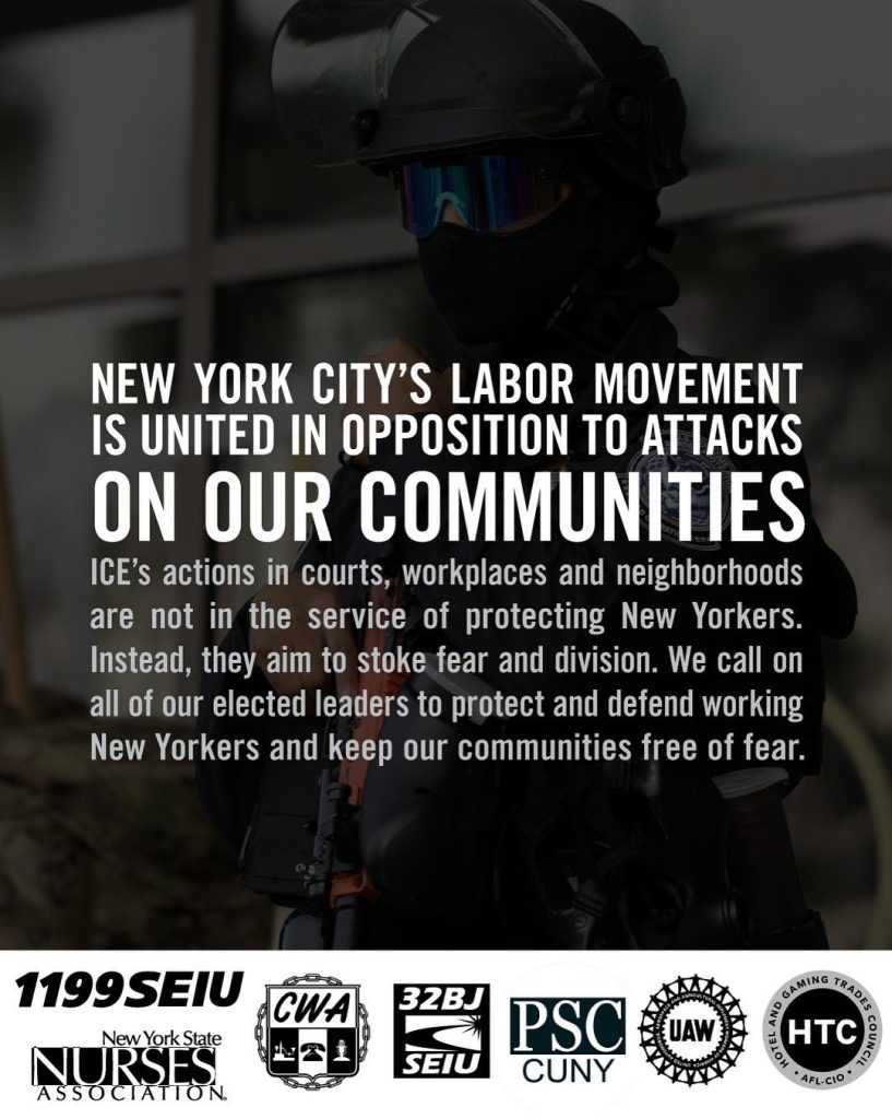 “New York City’s labor movement is united in sounding the alarm about the Department of Homeland Security’s plan to ‘flood the zone’ to intimidate, harass and racially profile immigrants across our city. We are deeply disturbed by ICE’s escalating tactics of targeting immigrants at courthouses, denying residents’ due process and civil rights, raiding workplaces, and firing munitions at protestors. These unlawful intimidation tactics have no place in New York City and will make our city less safe.