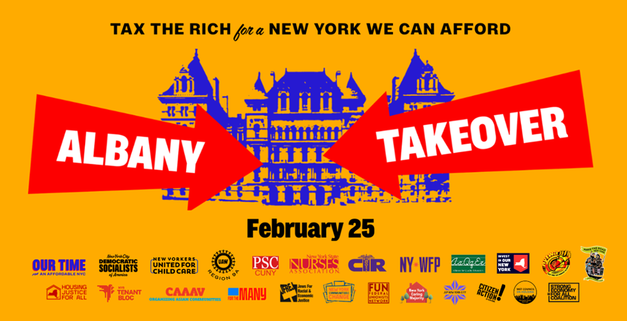 New Yorkers are demanding a better, more affordable life with universal childcare, free buses, and a free and fully funded CUNY system. We’re organizing to take over Albany on Wednesday, February 25th to win the higher taxes on corporations and the rich that are necessary to fund our affordability agenda and to protect our city and the services on which we depend. Both the state and city are facing massive financial pressures. Albany has to address more than $8 billion in federal cuts to our state’s healthcare system and City Hall has a looming $7 billion budget deficit. Making the rich and wealthy corporations pay their fair share is how we balance the budgets while also investing in the better life New Yorkers deserve.