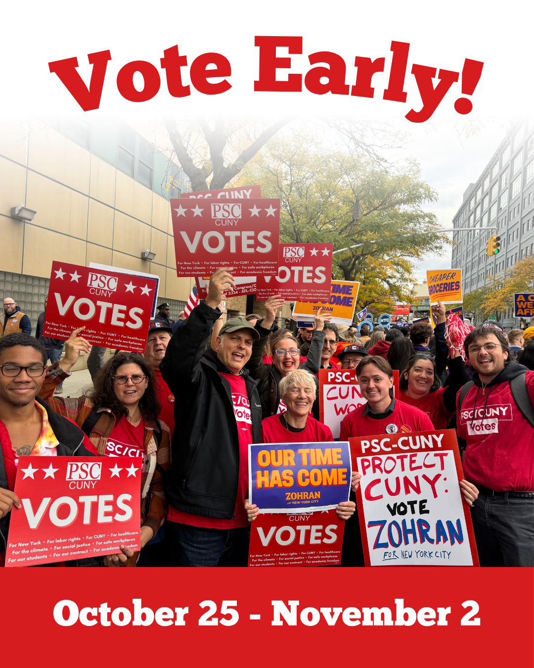 Early voting for the NYC General Election runs until Sunday, November 2nd, and Election Day is Tuesday, November 4th. PSC members are campaigning to elect Zohran Mamdani mayor and to support CUNY champions running for citywide office, borough president and City Council.