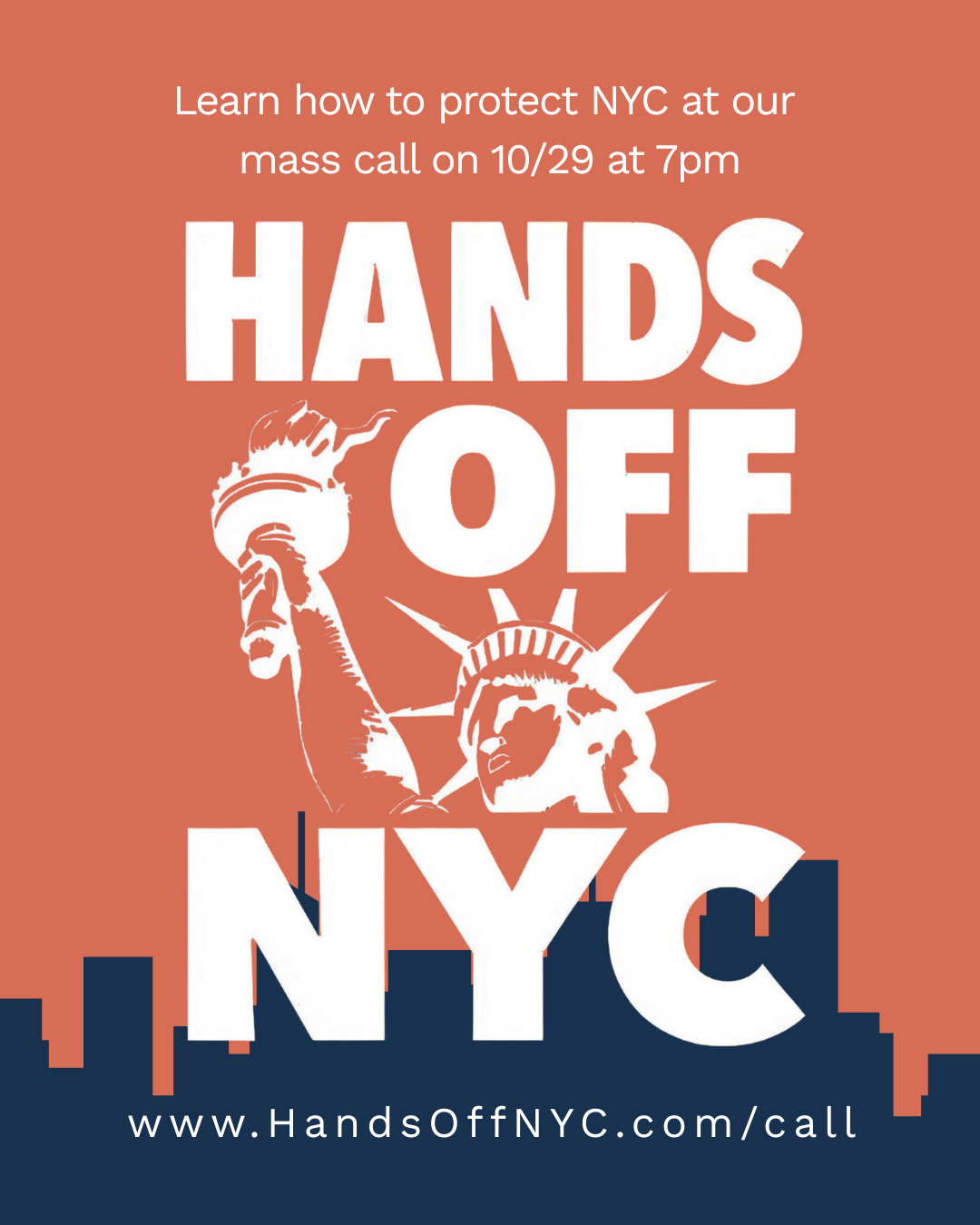 New York City has been directly threatened — and we’re coming together to respond. On Wednesday, October 29 at 7 PM, unions, faith leaders, and community groups are hosting a citywide mass call to talk about what we can do right now to resist the occupation, protect our neighborhoods, and get connected to the growing resistance across the city.