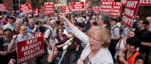 The PSC organized over a twelve-year period to stabilize healthcare funding for qualifying adjuncts. That meant moving adjunct healthcare from the PSC/CUNY Welfare Fund to the New York City plan. A key point of mobilization was a huge rally both outside and inside a Board of Trustees meeting on September 26, 2011 (see picture above). At that meeting, the B.O.T. agreed to seek city funding for adjnct healthcare. Almost three years later, on July 30, 2014, the PSC, the B.O.T. and the city signed an agreement that regularized health insurance for an important part of the CUNY teaching workforce and contributed to stabilizing the finances of the PSC-CUNY Welfare Fund.