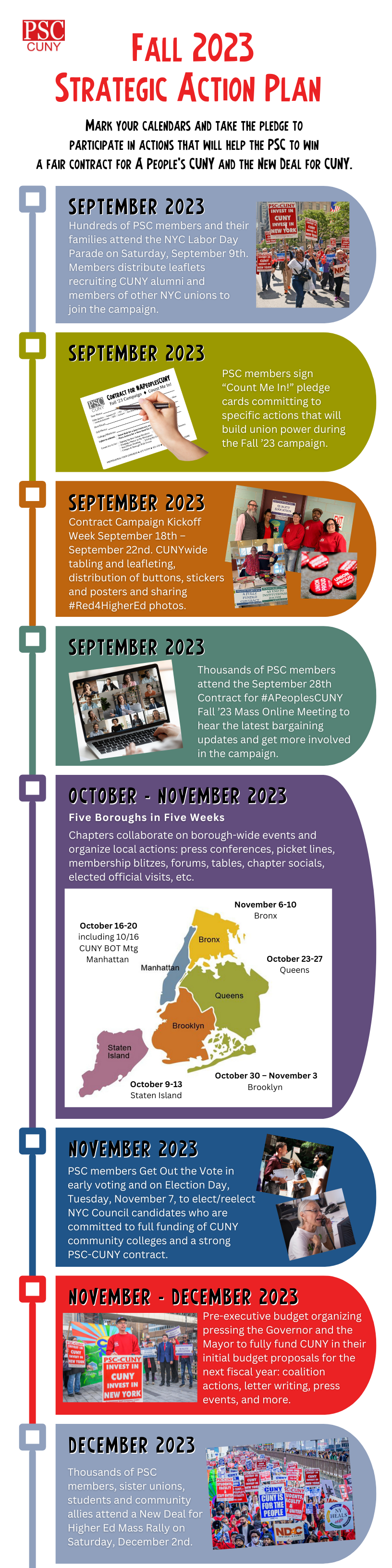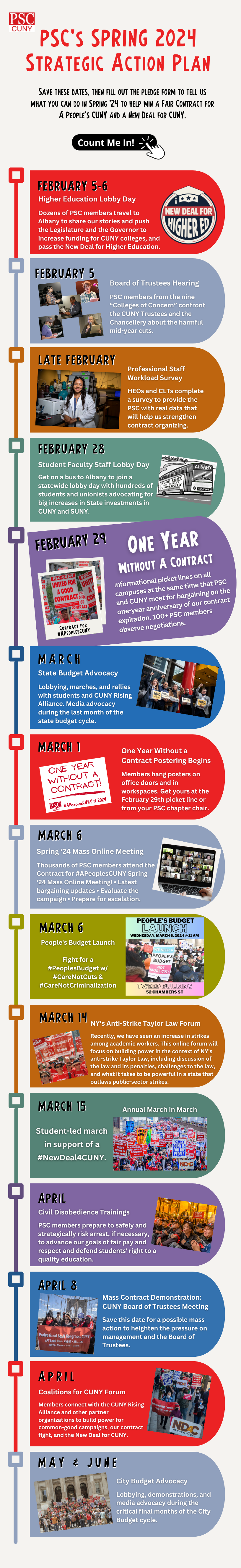 Our union contract expired February 28, 2023. The PSC is building power and capacity to win major new public investment in CUNY, pass the New Deal for CUNY, and settle a great new contract.