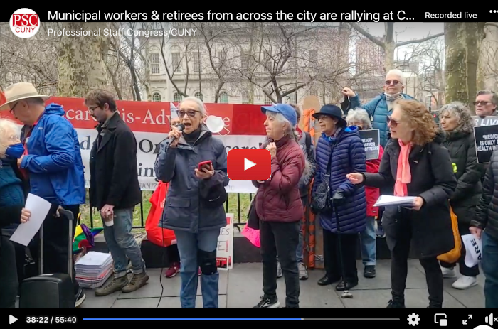 THE MARCH 31 EMERGENCY RALLY AT CITY HALL   On  Thursday, March  30,  the Adams administration signed a contract with Aetna Insurance to move 250,000 muncipal retirees (including CUNY faculty and staff) from traditional Medicare to a privatized Medicare Advantage program.  The next day, several hundred NYC retirees supported by active union brothers and sisters demonstrated in protest at City Hall.  Watch a video HERE.  (Starting at the 38 minute mark, view three PSC speakers — Cecelia McCall, Jen Gaboury and Evie Rich).